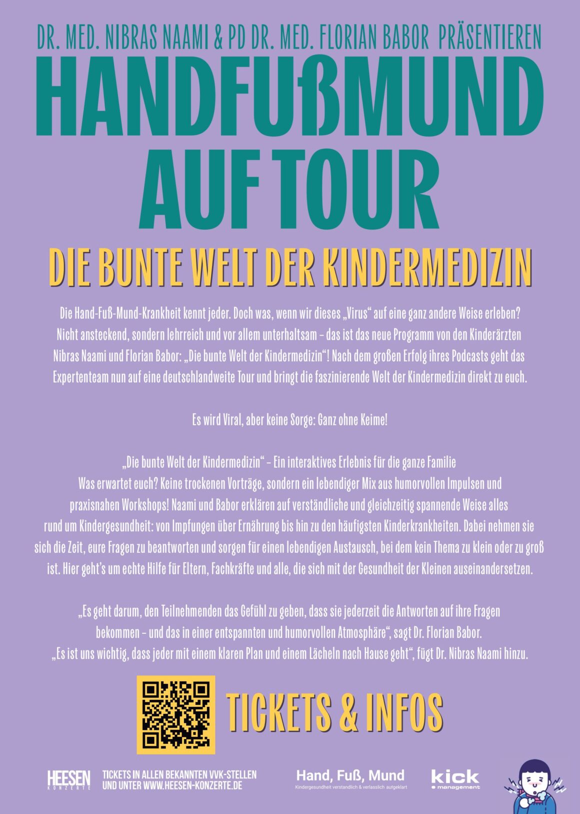 Dr.med Nibras Naami & PD Dr. med. Florian Babor HandFussMund auf Tour Die bunte Welt der Kindermedizin Ticktes: https://www.eventim.de/artist/handfussmund/?affiliate=TUG Rubrik:BookingKontakt:nicole.gross@kick-management.de
